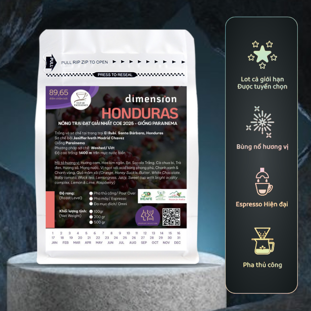 Mỗi túi cà phê gửi đến tay bạn không chỉ chứa đựng những hạt Parainema đạt giải Nhất thế giới, mà còn đi kèm bộ hồ sơ kỹ thuật chi tiết nhất từ Cup of Excellence. Dimension mời bạn trở thành người thẩm định, để tự mình đối chiếu những nốt hương từ Chocolate trắng, Bơ đến Mâm xôi và tìm thấy bí mật ẩn sau điểm số 89.65.