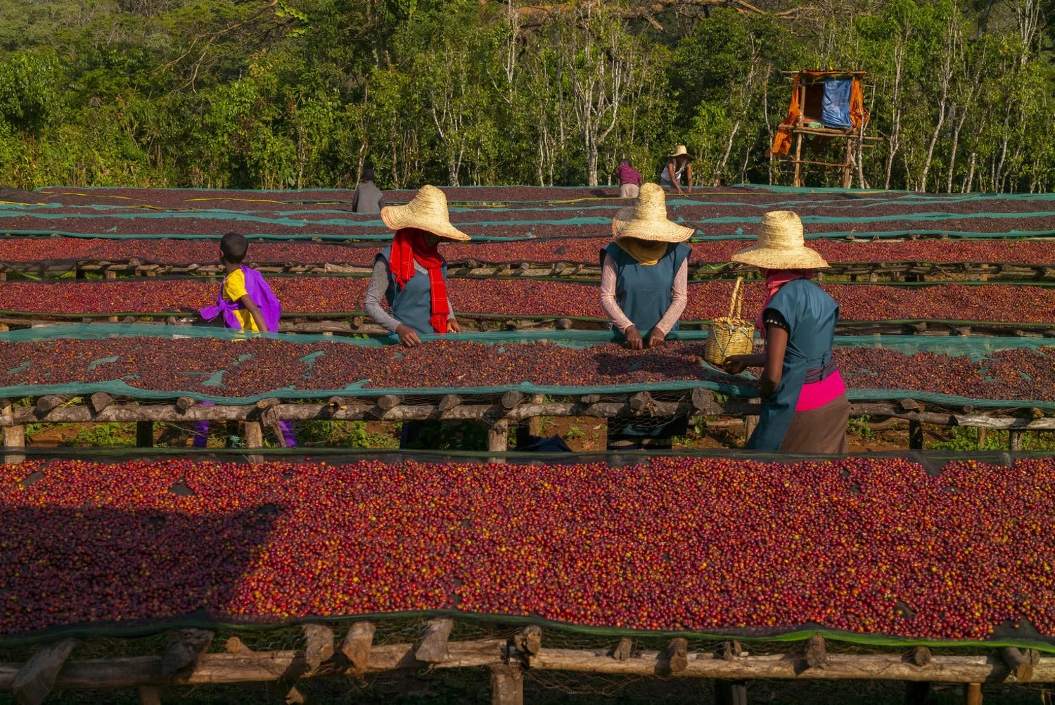 - Giai đoạn 4: Phơi khô trên giàn (Raised Beds): Cuối cùng, cà phê được trải mỏng trên các giàn phơi cao. Trong giai đoạn đầu, hạt được phủ bạt để tránh nắng gắt trực tiếp làm nứt vỏ trấu, sau đó phơi khô dần trong 12-15 ngày cho đến khi độ ẩm đạt mức 10.5% - 12%.